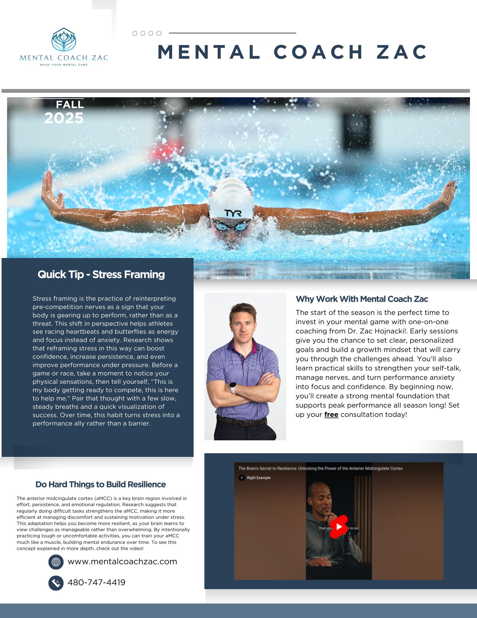 “Growing up, I was always considered a mental athlete, sometimes even having panic attacks before competitions. However, with Zac’s help, I was able to utilize these emotions that previously hindered my performance, raising me to new heights I didn’t know I could achieve. The lessons Zac has taught me have extended beyond the pool and into wherever my life takes me next. ”